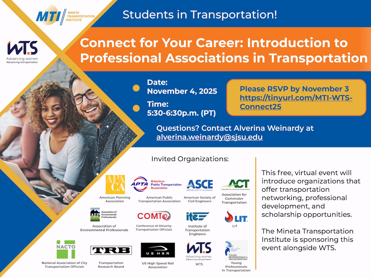 Connect for Your Career: An Introduction to Professional Associations in Transportation (2025) - Online 5:30- 6:30p.m. (PT) | Link to register. WTS-SF Bay Area and the Mineta Transportation Institute (MTI) of San Jose State invite you to join us for a free virtual event "Connect for Your Career: An Introduction to Professional Associations in Transportation." It will introduce university students and emerging professionals to transportation organizations that offer networking, professional development opportunities, and/or scholarship opportunities. Invited organizations include: