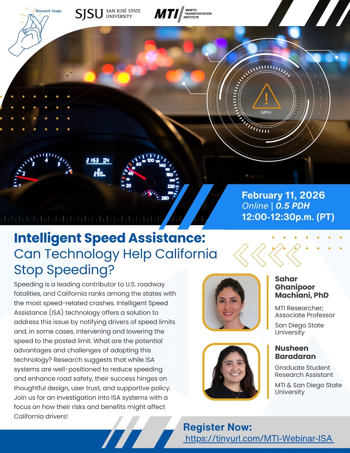 Intelligent Speed Assistance: Can Technology Help California Stop Speeding? - Online 12:00-12:30p.m. (PT) | Link to register. This MTI Research Snaps webinar is based on the MTI-led California State University Transportation Consortium report, "A Holistic Inquiry of Intelligent Speed-Assist Technology: Safety Impacts, Technology Implementation, and Challenges." Speeding is a leading contributor to U.S. roadway fatalities, and California ranks among the states with the most speed-related crashes. Intelligent Speed Assistance (ISA) technology offers a solution to address this issue by notifying drivers of speed limits and, in some cases, intervening and lowering the speed to the posted limit. What are the potential advantages and challenges of adopting this technology? Research suggests that while ISA systems are well-positioned to reduce speeding and enhance road safety, their success hinges on thoughtful design, user trust, and supportive policy. Join us for an investigation into ISA systems with a focus on how their risks and benefits might affect California drivers! Presenter: