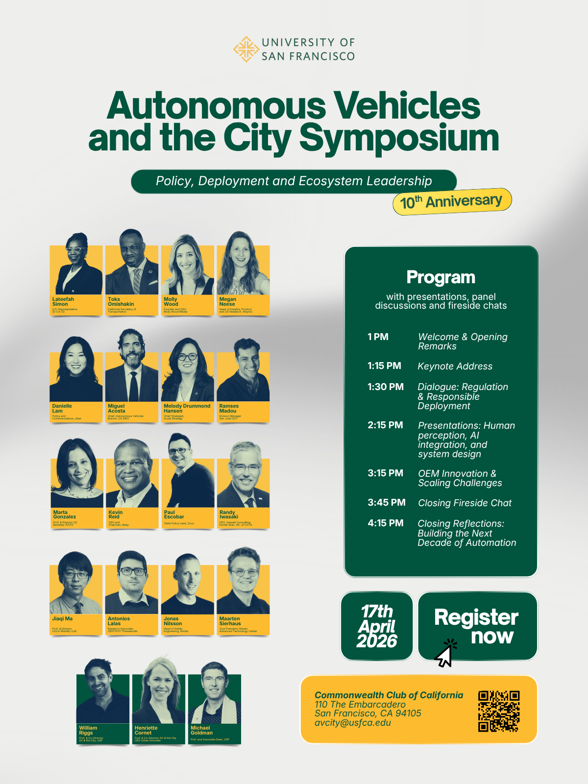The 2026 Autonomous Vehicles and the City Symposium marks our 10th anniversary, and goes “Beyond the Tech” to focus on building a robust automation ecosystem that works for people and cities alike. From AI perception and roadway safety to manufacturing friction, regulatory clarity, curb and edge management, and seamless integration with public transit, this year’s convening examines how automation can reduce collisions, advance Vision Zero goals, and expand mobility choice.