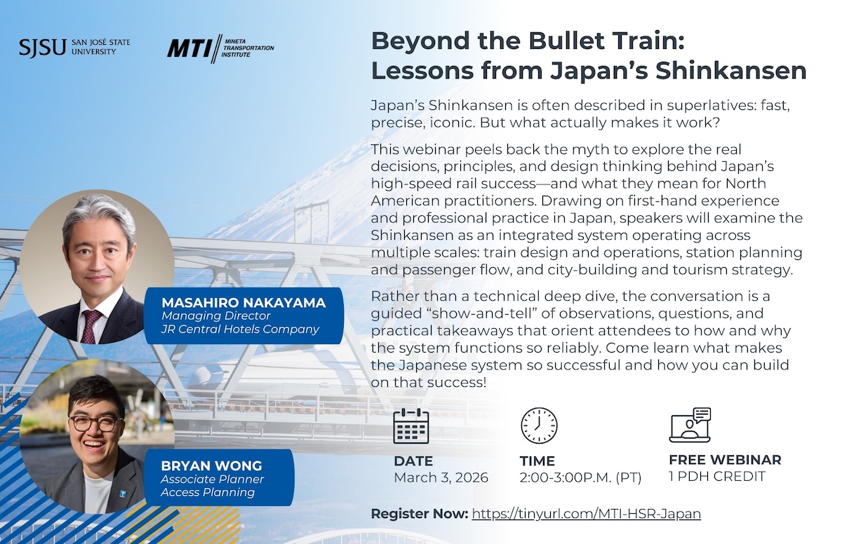 This webinar peels back the myth to explore the real decisions, principles, and design thinking behind Japan’s high-speed rail success—and what they mean for North American practitioners. Drawing on first-hand experience and professional practice in Japan, speakers will examine the Shinkansen as an integrated system operating across multiple scales: train design and operations, station planning and passenger flow, and city-building and tourism strategy.