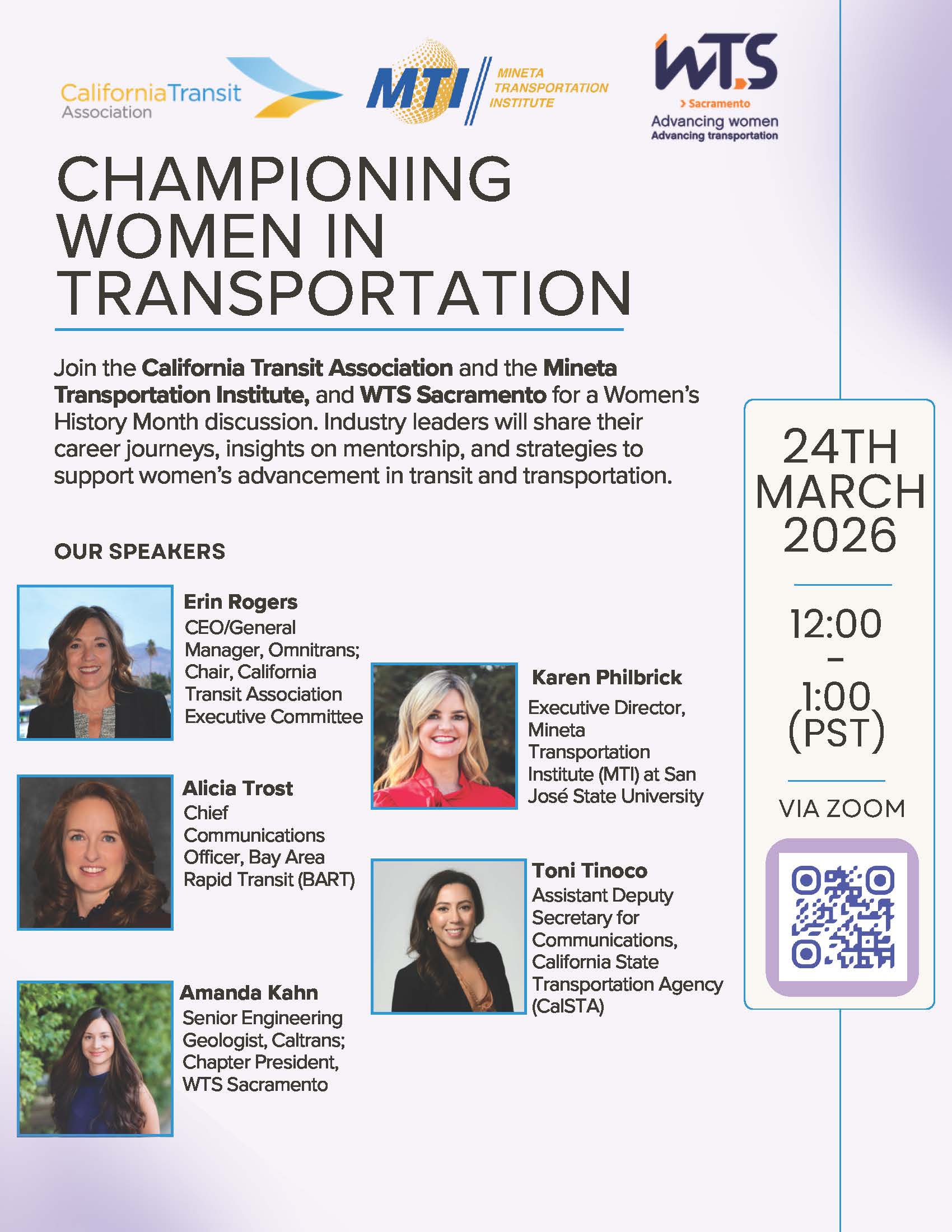 Join the California Transit Association, in partnership with the Mineta Transportation Institute, for a discussion celebrating Women’s History Month. Hear from our panel of industry leaders about the importance of mentorship and champions for women in transit and transportation. As female leaders work to reach the C-suite, how can we work collectively to empower and inspire our female colleagues. Our panel will discuss their personal career trajectories, share best practices, and advice.
