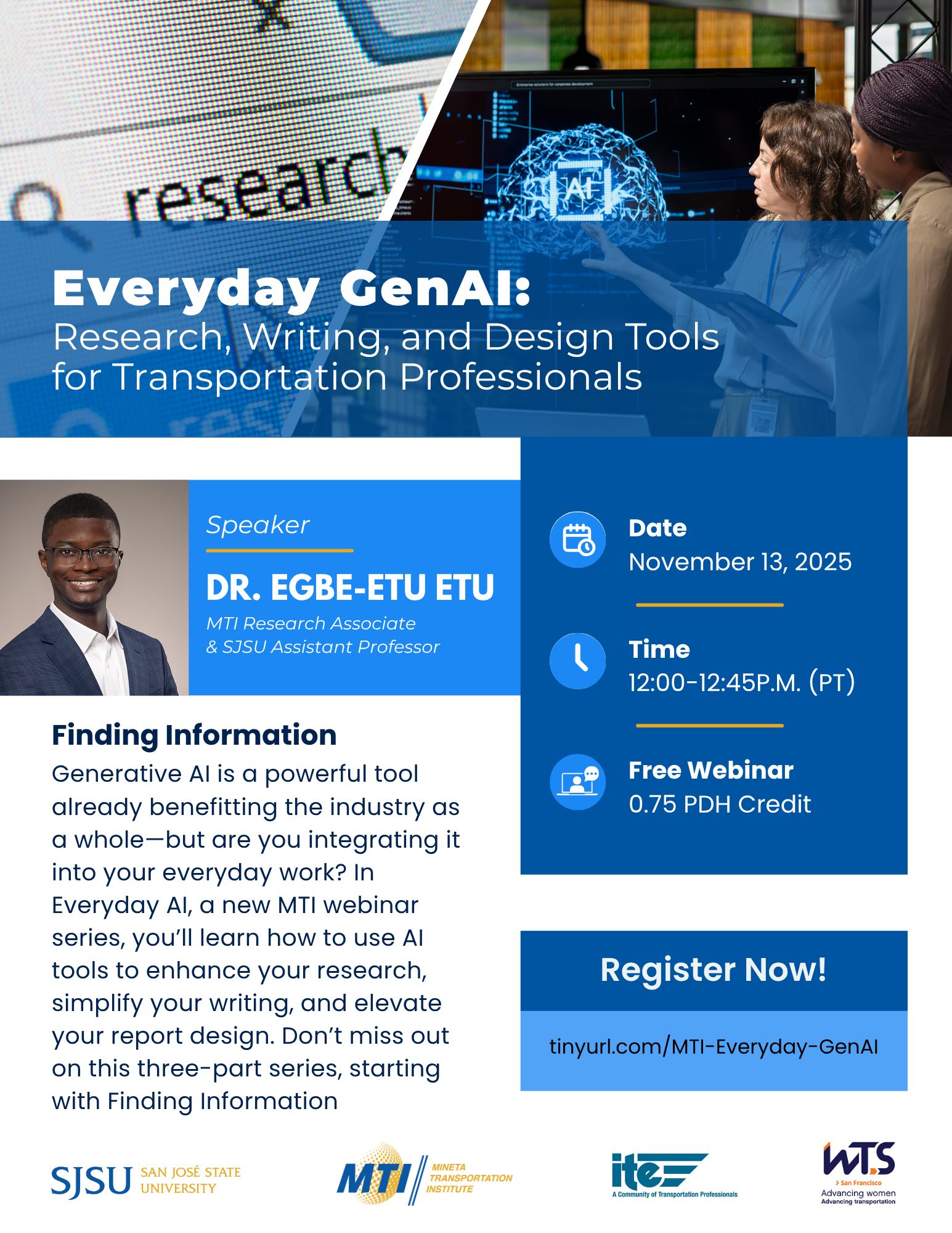 Learn how to use free GenAI tools to quickly find transportation data and information. SJSU Professor Egbe-Etu Etu, an expert in transportation data analytics, will teach strategies for asking the right questions (“prompt engineering," in AI-speak) and validating results. Join us as we explore how GenAI can empower transportation professionals at every level to work more efficiently and make better data-driven decisions.