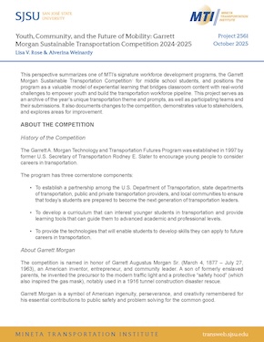 This perspective summarizes one of MTI’s signature workforce development programs, the Garrett Morgan Sustainable Transportation Competition1 for middle school students, and positions the program as a valuable model of experiential learning that bridges classroom content with real-world challenges to empower youth and build the transportation workforce pipeline. This project serves as an archive of the year’s unique transportation theme and prompts, as well as participating teams and their submissions. It also documents changes to the competition, demonstrates value to stakeholders, and explores areas for improvement.
